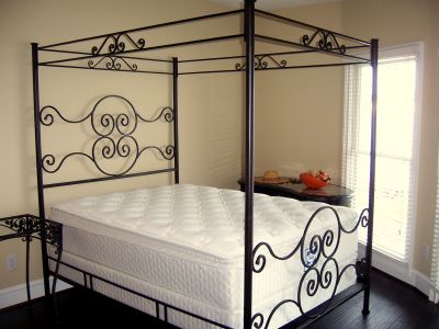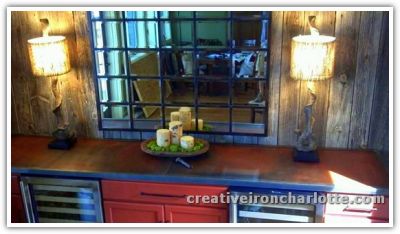 We had just finished the iron mirrors for this master bath when our customer came up with the idea of creating a fabric canopy over the tub. Not sure how that was possible we built this frame to compliment the mirrors and later fabric was draped over it!