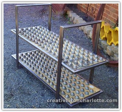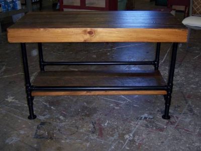 This table was built to use as an center island in a kitchen. It was fabricated out of plumbing pipe parts that we put together,the wood shelves we made from reclaimed oak.