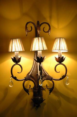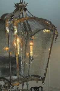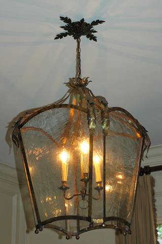 Hanging above a 60" round dining table, it was hard to find a fixture that was large enough. We were commissioned to create this 2 foot tall iron chandelier from scratch. We gold leafed it and had seeded glass installed, it makes quite the statement in the dinning room.