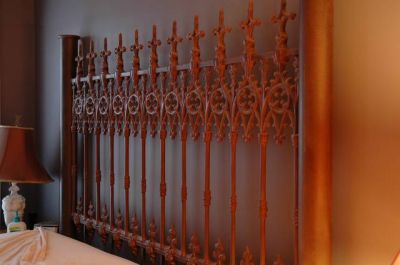 Gothic art was a Medieval art movement that developed in France out of romanesque in the mid-12th century, led by the concurrent development of Gothic architecture. Gothic influences have been around for centuries and present themselves in various forms, as with this Gothic bed. It was made of cast pannels with a rust patina.