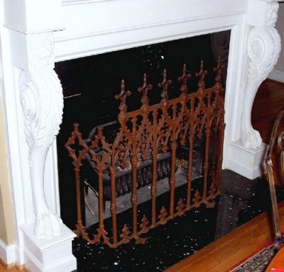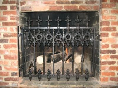 These gothic panels are made of cast iron and we cut and made them fit to use them as this unique fireplace screen. Iron casting are a great way to get that old world feel.