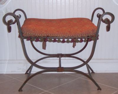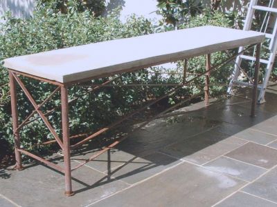 This a neat little iron settee that can be used just about anywhere. This one was made to fit between two pedestal sinks in a jack and jill bathroom. It can also be used as a foot stool or a little table on a porch.