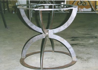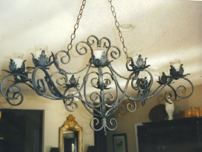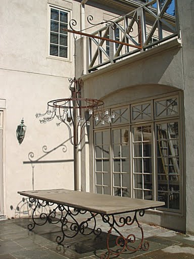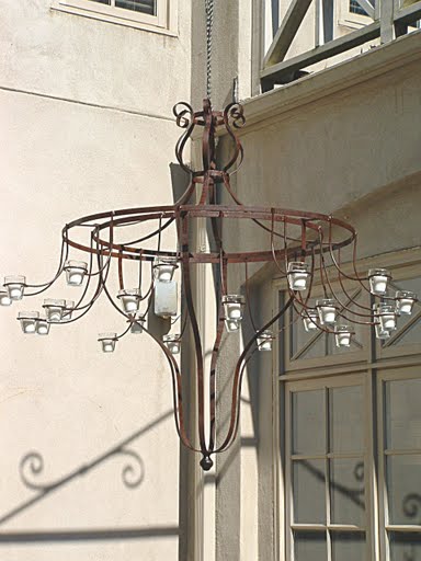 This was a cool chandelier we created for a outdoor living space, it was 4 feet tall and held 24 glass votives. The next challenge we had was how to hang it with no roof! We forged the iron bracket so the chandelier would extend 6 feet out over the concrete table below it.
