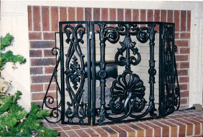 Large custom stone fireplaces have become very popular indoors and for outdoor living areas, but the problem is its hard to find a screen that fits the large openings. This iron screen was very simple in design and was made to follow the inside perimeter of the opening, it fit beautifully with a half inch revel all the way around.