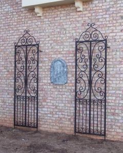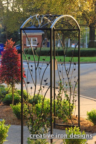 In the front gardens of Presbyterian Hospital stands these two wrought iron trellises we created. They are 8 feet tall and 6 feet wide and have stems, vines and leaves all made of metal. The leaves were cut and forged to a realistic shape.